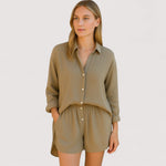 Dieses Set mit lässigem Hemd und Shorts wurde für Frauen entworfen, die mühelosen Stil und atmungsaktiven Komfort schätzen.